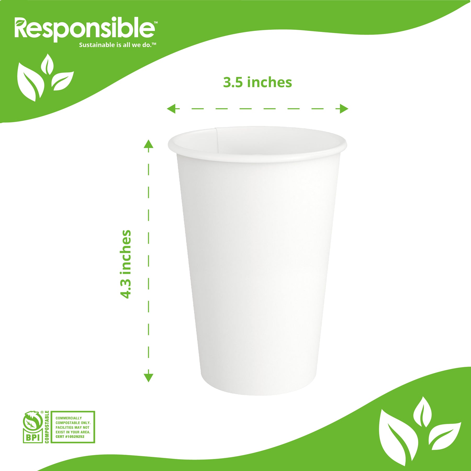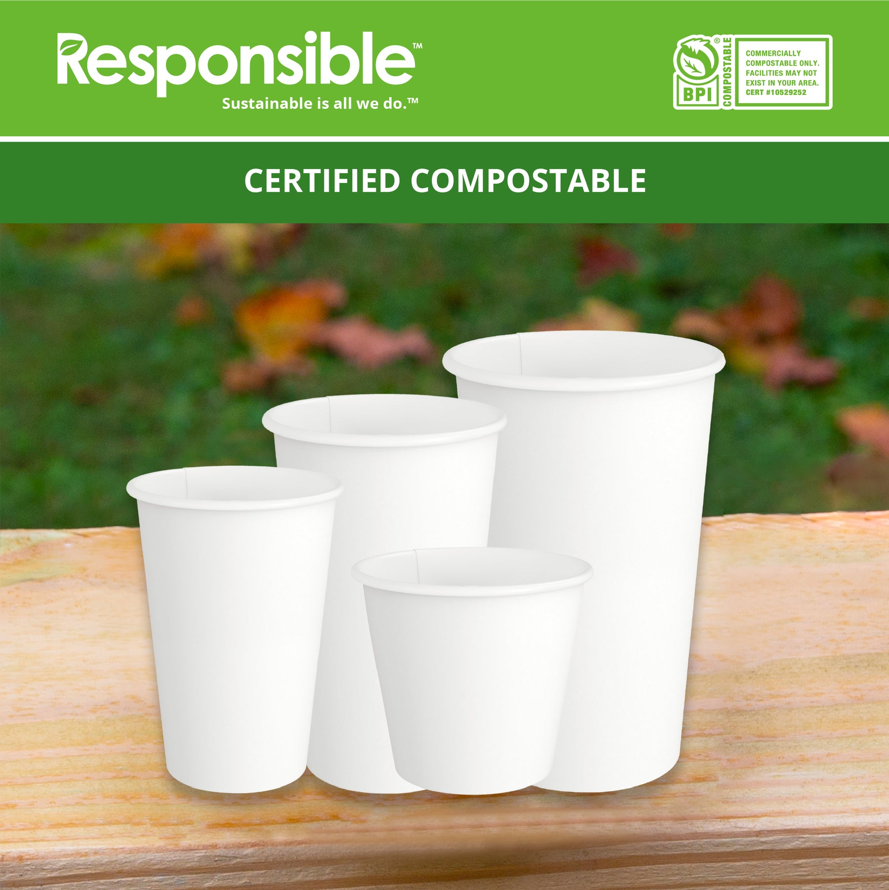 Responsible Products paper cups are eco-friendly, made from plant fiber. Ideal for hot drinks, these cups are compostable, durable, soak proof and drip proof. Our paper cups are the most sustainable choice for serving hot drinks at breakfast, lunch, or dinner at special events, catered events, takeout restaurants, cafeterias, and cafes.