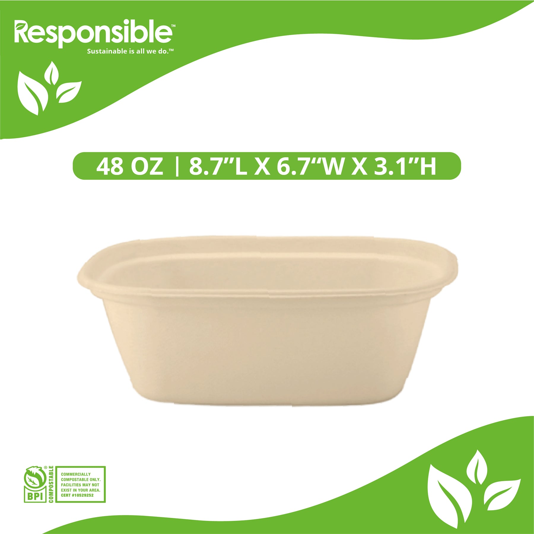 Responsible Products bowls are eco-friendly, made from bamboo and sugarcane fiber. Ideal for hot or cold food, these plates are durable, microwave safe, freezer safe, and have no wax or plastic lining. They are the most sustainable choice for serving breakfast, lunch, or dinner at special events, catered events, takeout restaurants, cafeterias, and cafes. Meets ASTM Standards for compostability. Commercially compostable only. Facilities may not exist in your area. Check with local officials.