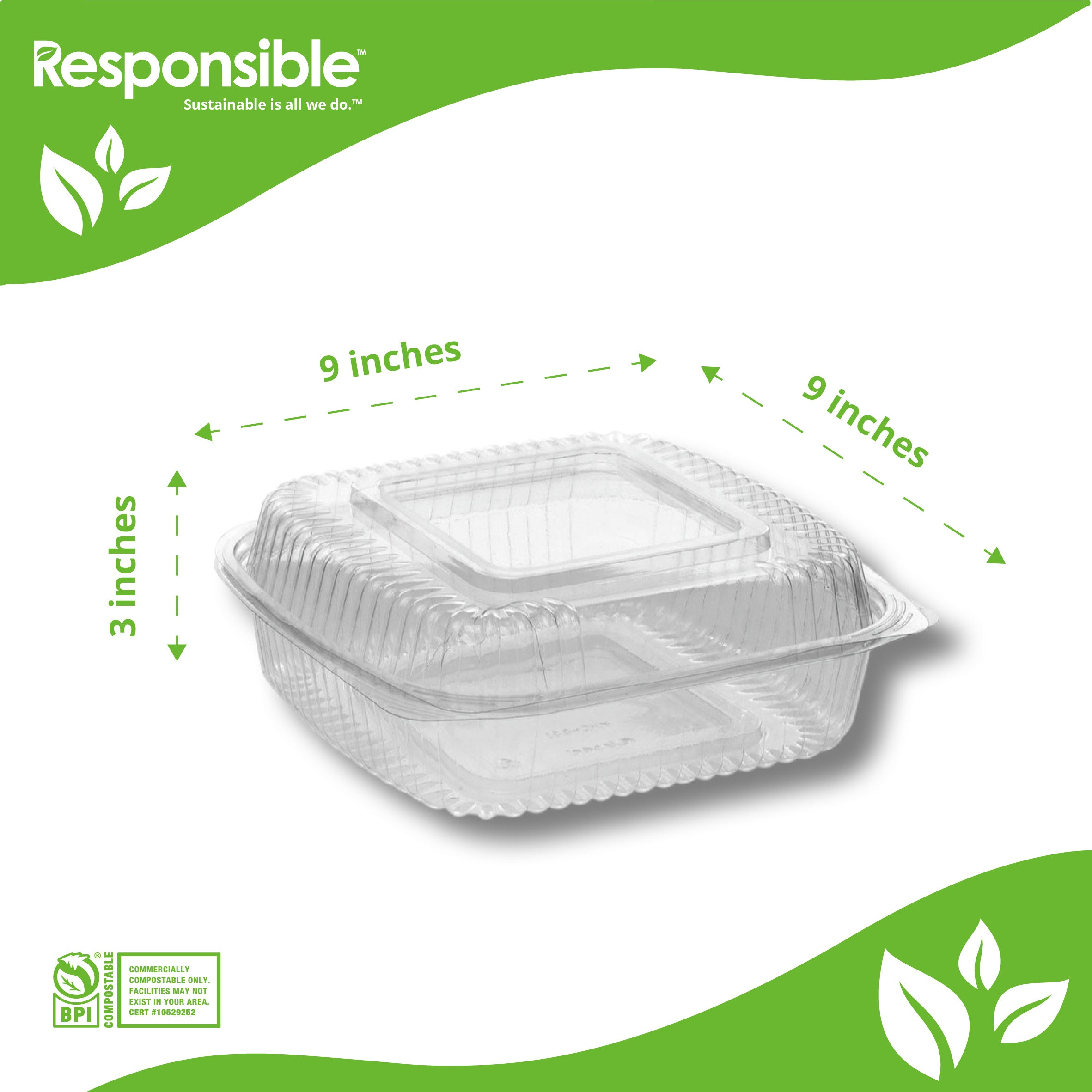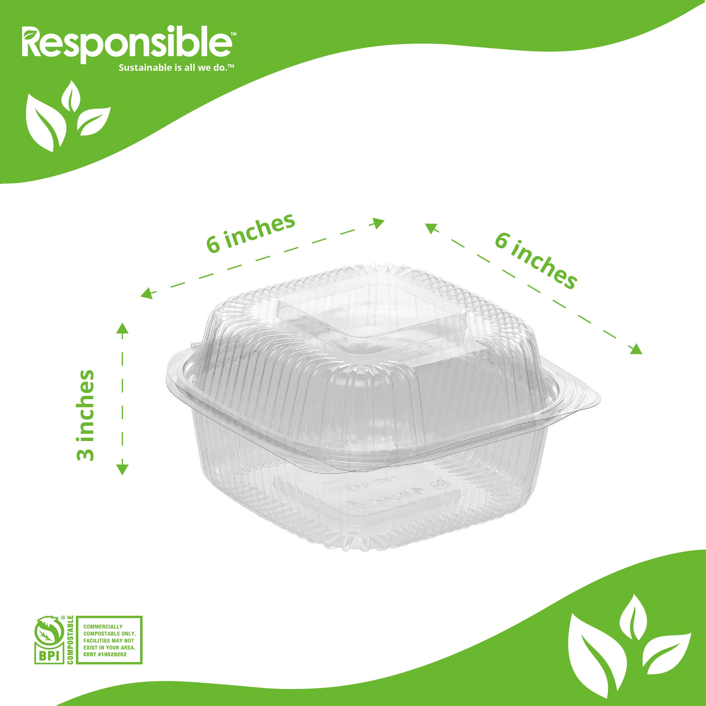 Responsible Products clear hinged containers are eco-friendly, made from renewable and compostable materials. Ideal for cold and room temperature foods, these clear containers are compostable, durable, and soak proof. Our clear containers are the sustainable choice for serving all types of foods at special events, catered events, takeout restaurants, cafeterias, and cafes.