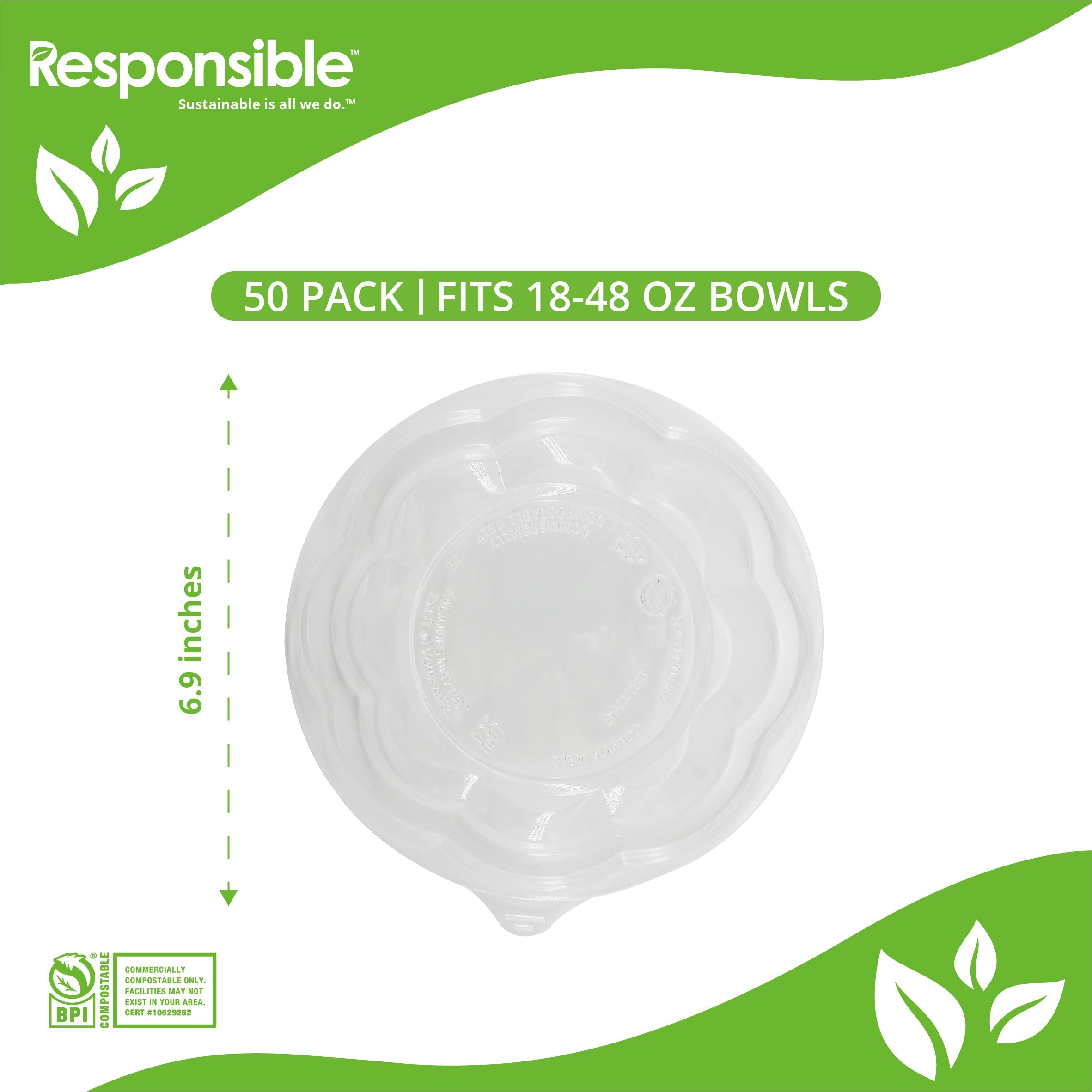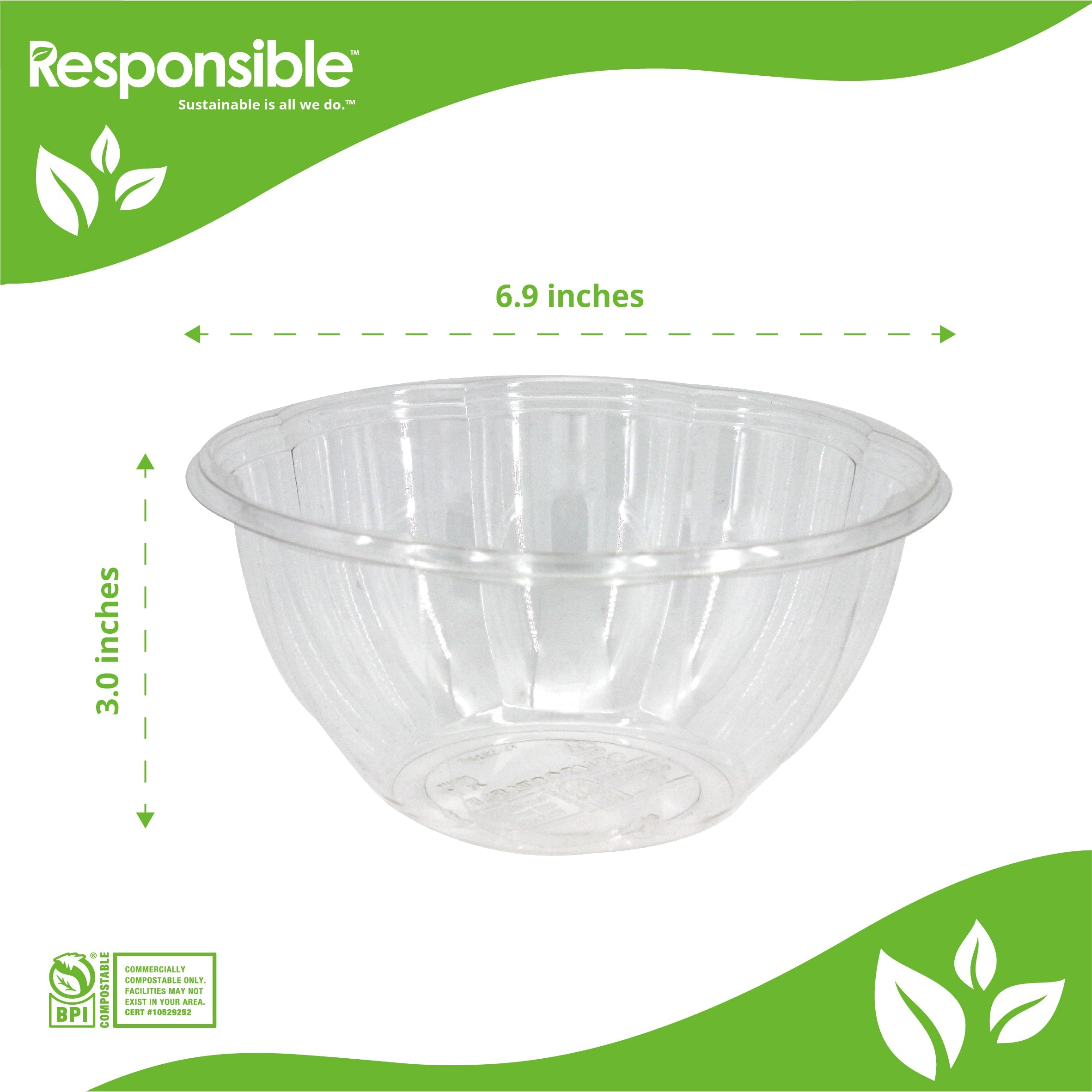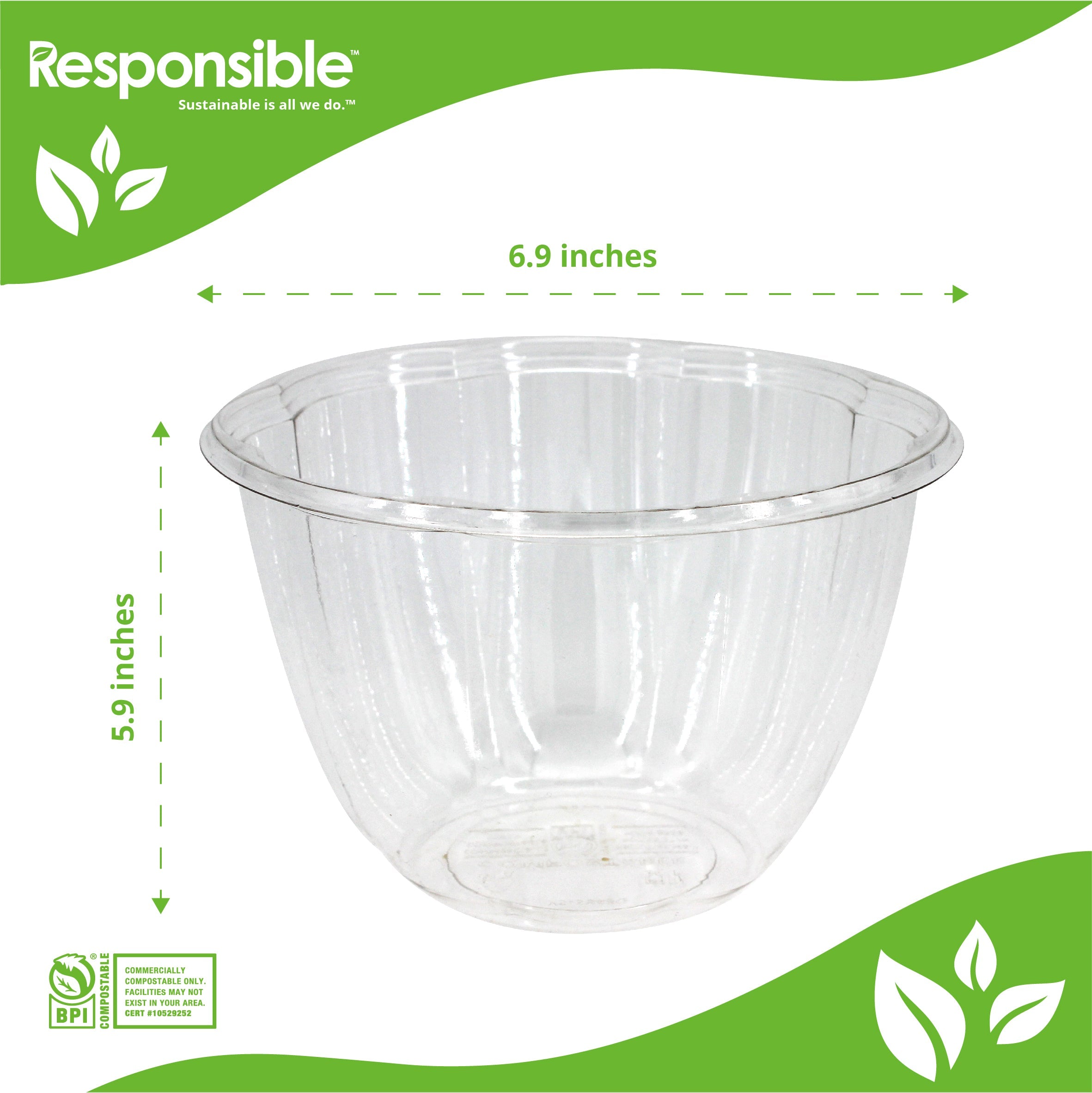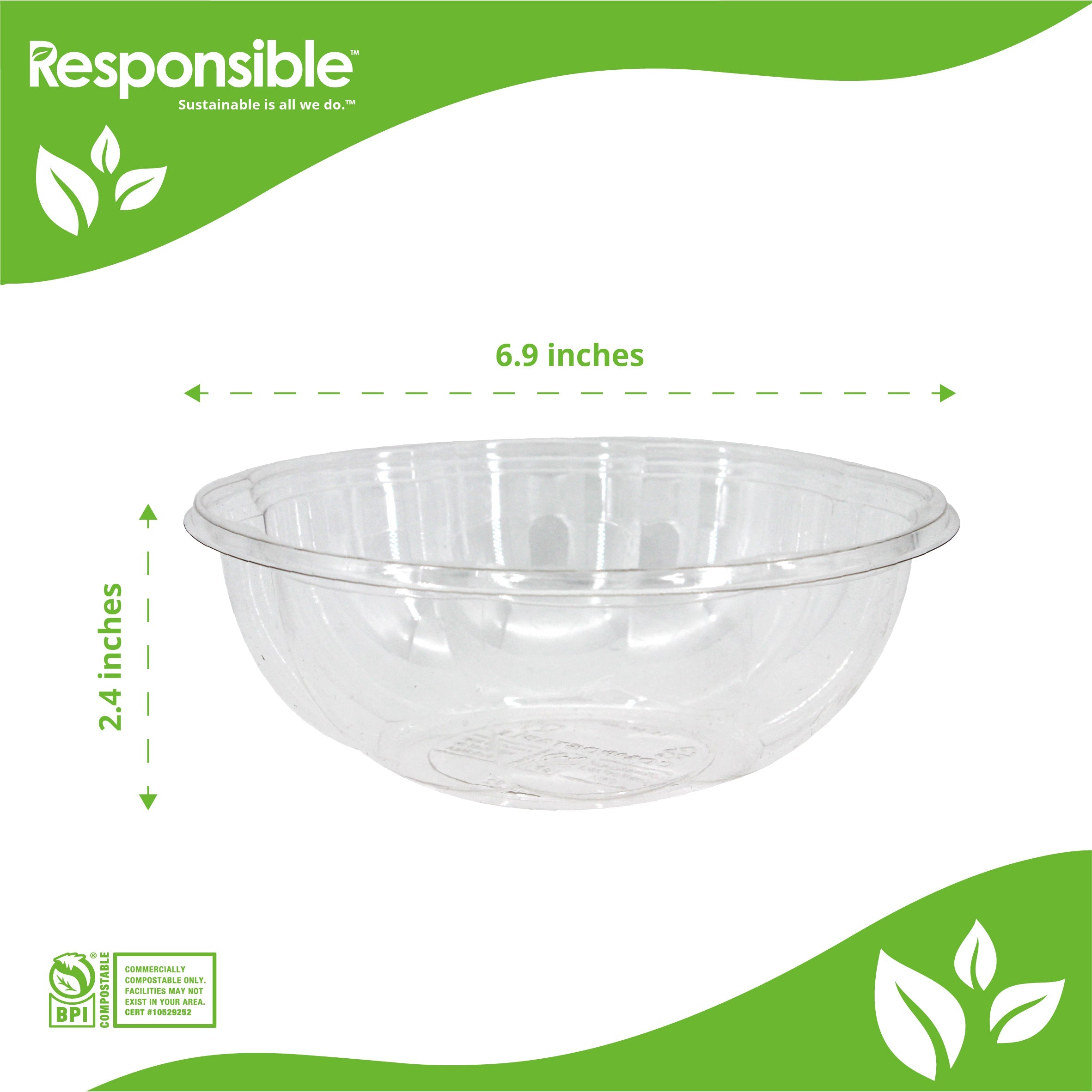 Responsible Products clear salad bowls are eco-friendly, made from renewable and compostable materials. Ideal for cold and room temperature foods, these clear bowls are compostable, durable, and soak proof. Our clear bowls are the sustainable choice for serving all types of foods at special events, catered events, takeout restaurants, cafeterias, and cafes.